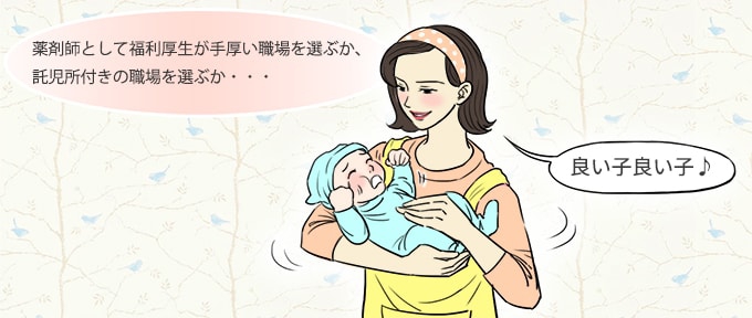 託児所が職場内にあることによって、様々な利便性や安心感を得ることができます。 また、出産後も働き続けたい女性の薬剤師さんは、産休・育休制度、時短勤務制度などが用意されている職場で働くと良いでしょう。 産休は労働基準法で定められている労働者の権利ですが、産休中の給与については規定されていません。つまり、給与を支払うかどうかは企業に一任されているということです。